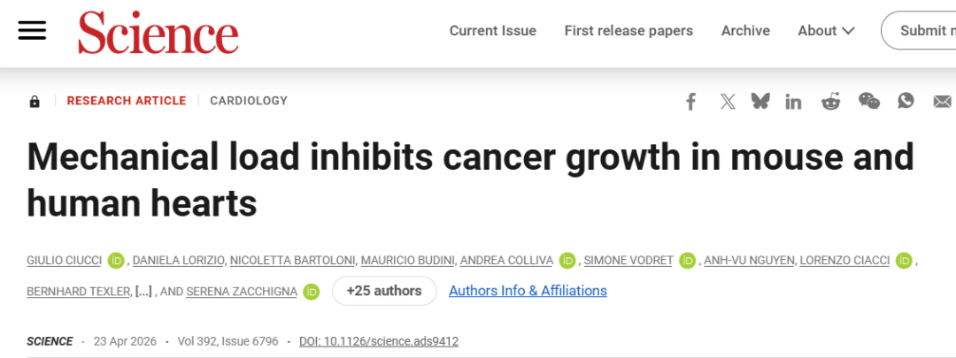 [1]Giulio Ciucci et al.,Mechanical load inhibits cancer growth in mouse and human hearts. Science392, eads9412(2026). DOI:10.1126/science.ads9412