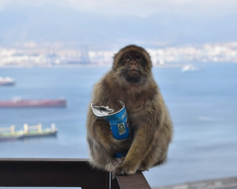 猕猴和罐装薯片。| Martin Nicourt/Gibraltar Macaques Project/PA
