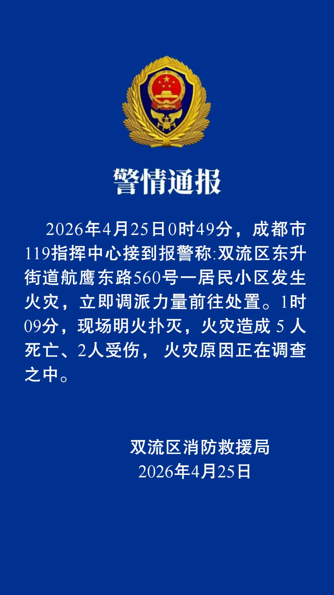 2026年4月25日0时49分,成都市119指挥中心接到报警称:双流区东升街道航鹰东路560号一居民小区发生火灾,立即调派力量前往处置。1时09分,现场明火扑灭,火灾造成5人死亡、2人受伤,火灾原因正在调查之中。