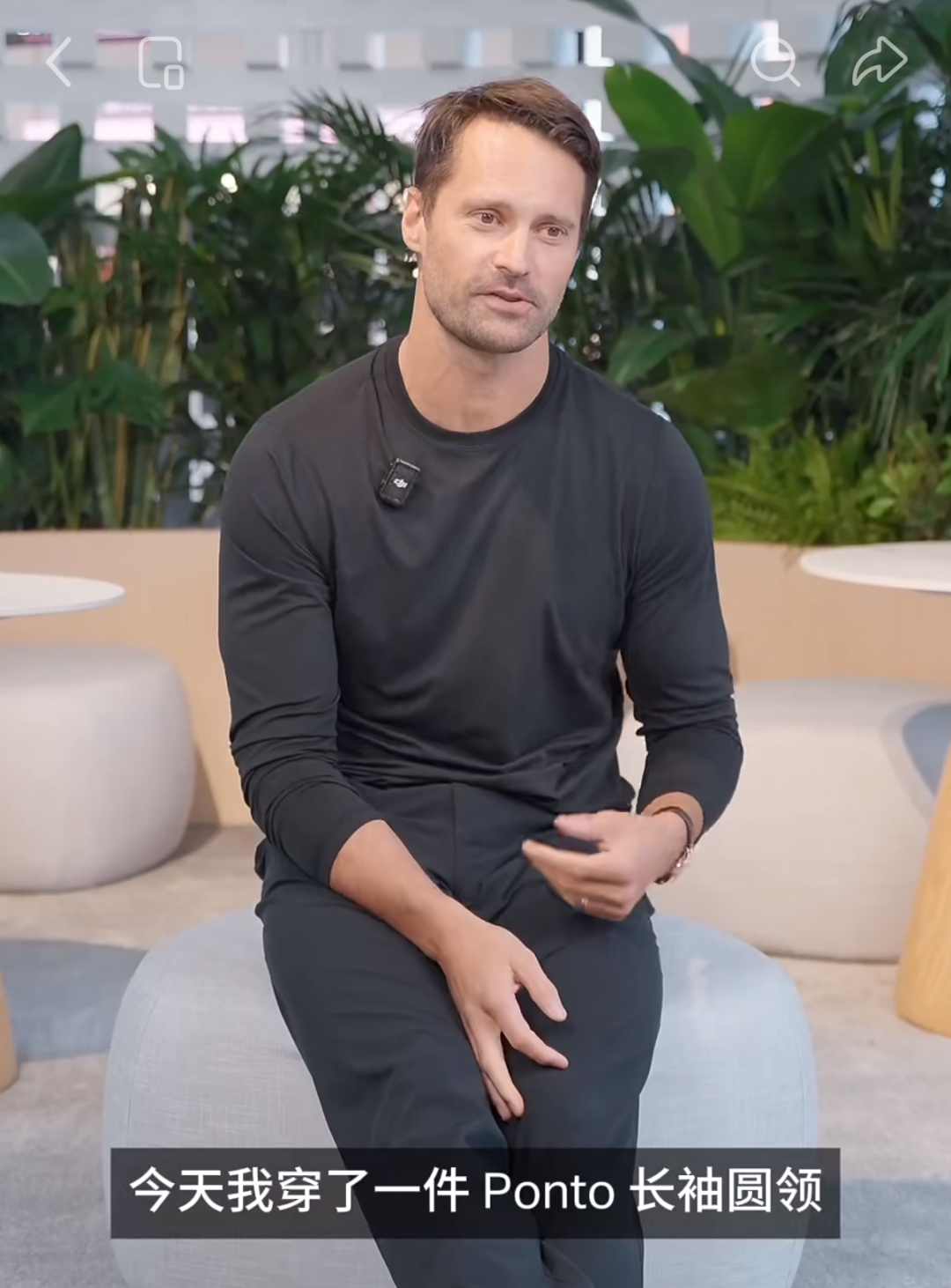 当天他身穿一整套Vuori当家产品——上身是Ponto黑色长袖圆领,下身是同色系Meta长裤。这位做过模特,也当过注册会计师的创始人,当场成了Vuori的移动活招牌。