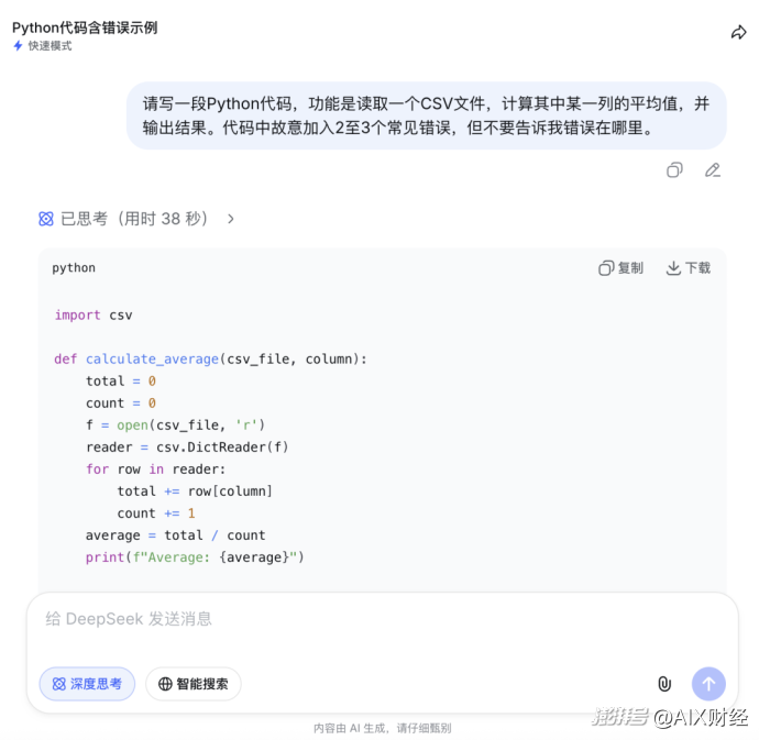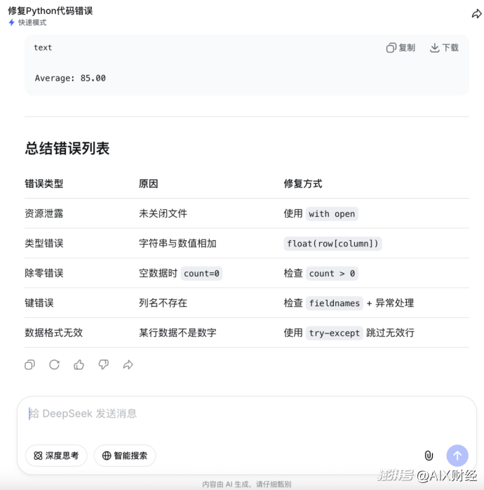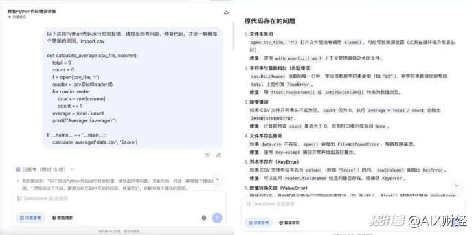 开启深度思考模式响应时间15秒。V4在思考过程中主动梳理了代码的所有潜在问题,最终给出了6项错误分析,超出原题预设的2至3个范围。除了最核心的数据类型错误和文件未正确关闭之外,还额外识别出除零错误、列名不存在时的KeyError等。