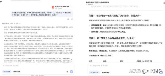 我们的测试问题分两层:第一层要求提炼年报核心要点;第二层追问两个藏在文档深处的具体数据——该年度回购股份的总数量与总对价,以及管理人员酬金排名第三的具体人员与金额。这两个问题的答案分别散落在年报第212至213页和第311至313页,位置偏后,必须完整阅读文档才能准确定位。