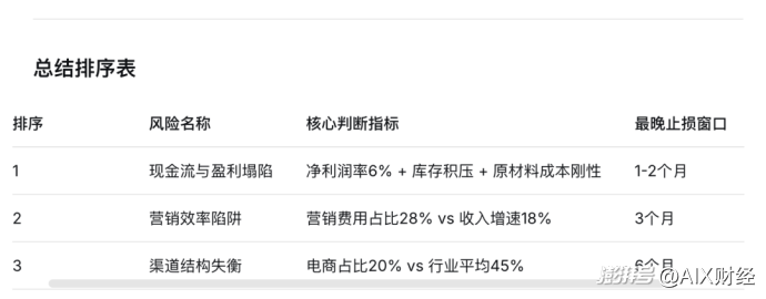最终它给出的三个优先风险依次是:库存积压与现金流风险排第一; 盈利能力持续恶化排第二,中端市场被抢占与渠道结构性短板排第三,并均给出了充分理由。