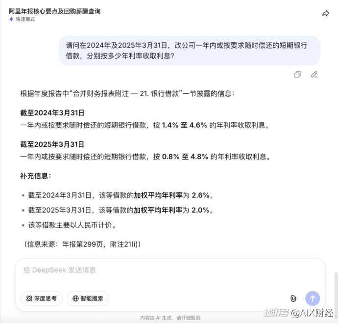 此外,在追加提问短期银行借款利率区间时,我们关闭了“深度思考”,选择Non-think模式,V4同样准确找到年报数据,信息来源同样精确到页码。