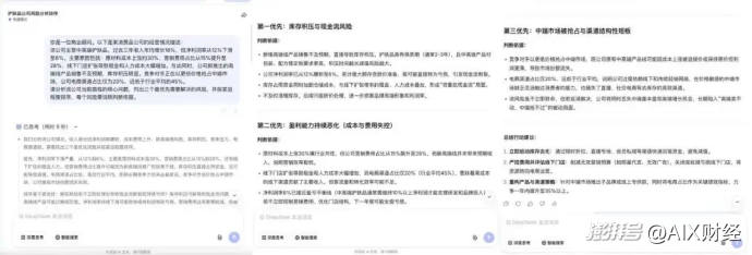深度思考响应用时9秒。V4在思考过程中先完成了问题拆解:将所有负面信号归类为现金流威胁、盈利能力恶化、市场结构性风险三个维度,再依据“若不立即处理会导致现金流断裂或持续亏损”的紧迫性标准完成排序,逻辑链条清晰可见。