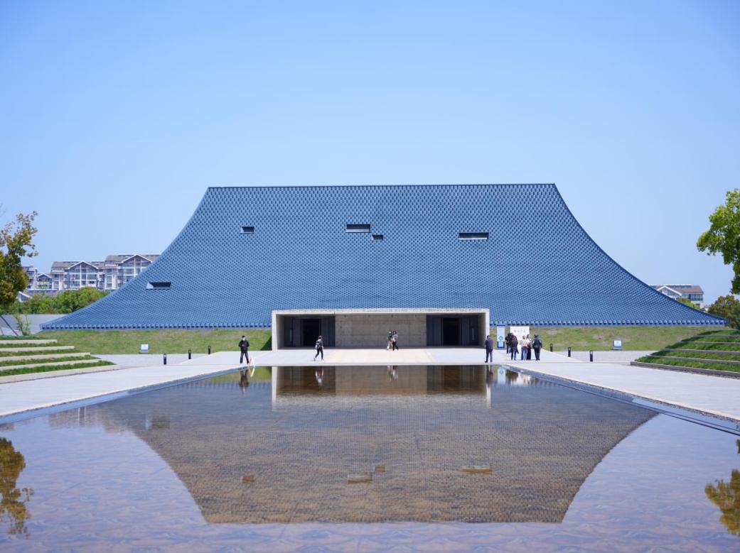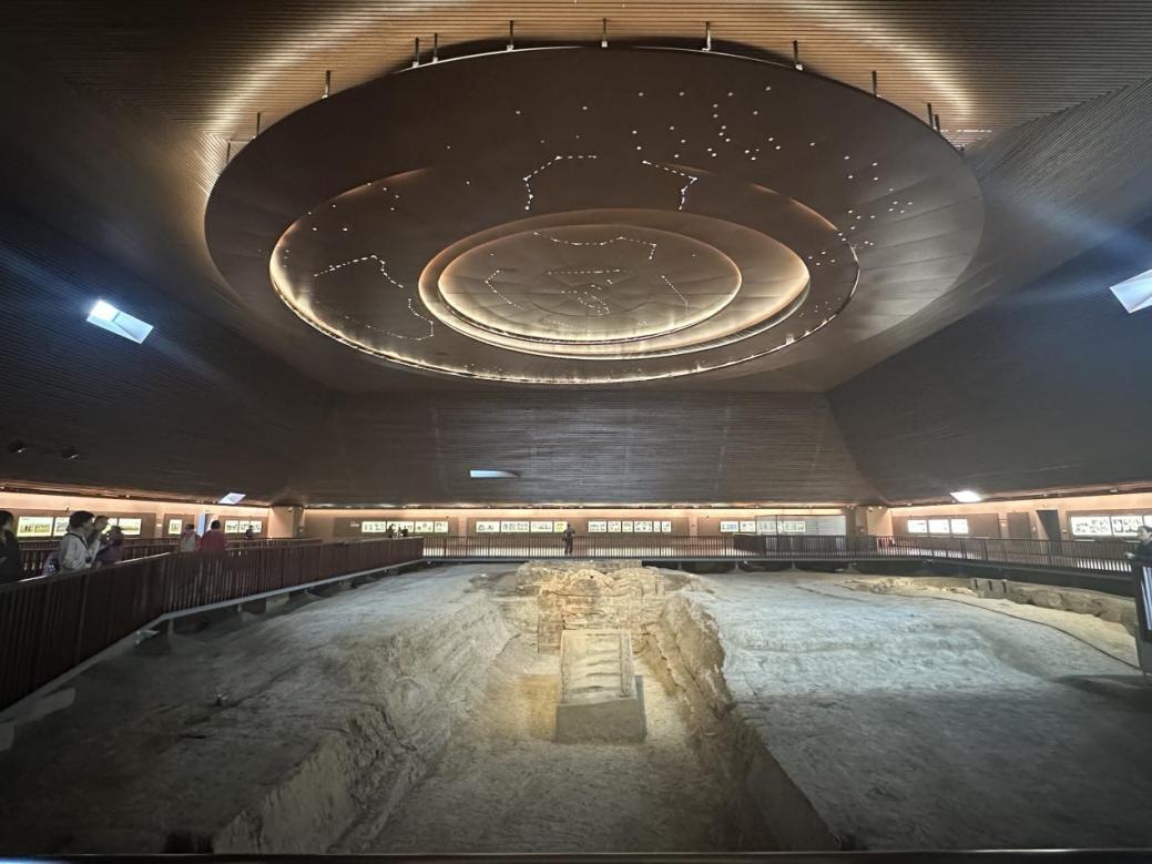 紧接着我们来到了隋炀帝陵遗址公园。帝陵遗址位于公园正中,遗址上方有一个四面呈梯形的保护设施,外观借鉴隋唐时期帝陵的“覆斗”形制,并与传统建筑庑殿顶形式相结合,被誉为“落地的皇冠”。“皇冠”的南侧是青史朗鉴,这是一方长49米,宽14米的长方形景观水池,代表的是隋炀帝杨广49年的岁月中,当朝执政达14年。进入墓穴,抬头可见穹顶上北斗七星、紫微星等星象,周边是十年考古发掘期间的图片展示、隋炀帝的生平3D影片和墓穴中出土的隋炀帝的两枚牙齿。遗址屋面开有不同尺寸的13个小窗,这些小窗的位置和角度通过精密计算,在每年冬至日、夏至日,以及隋炀帝忌日,阳光会透过窗户,刚好照射在隋炀帝及萧后的墓室上。