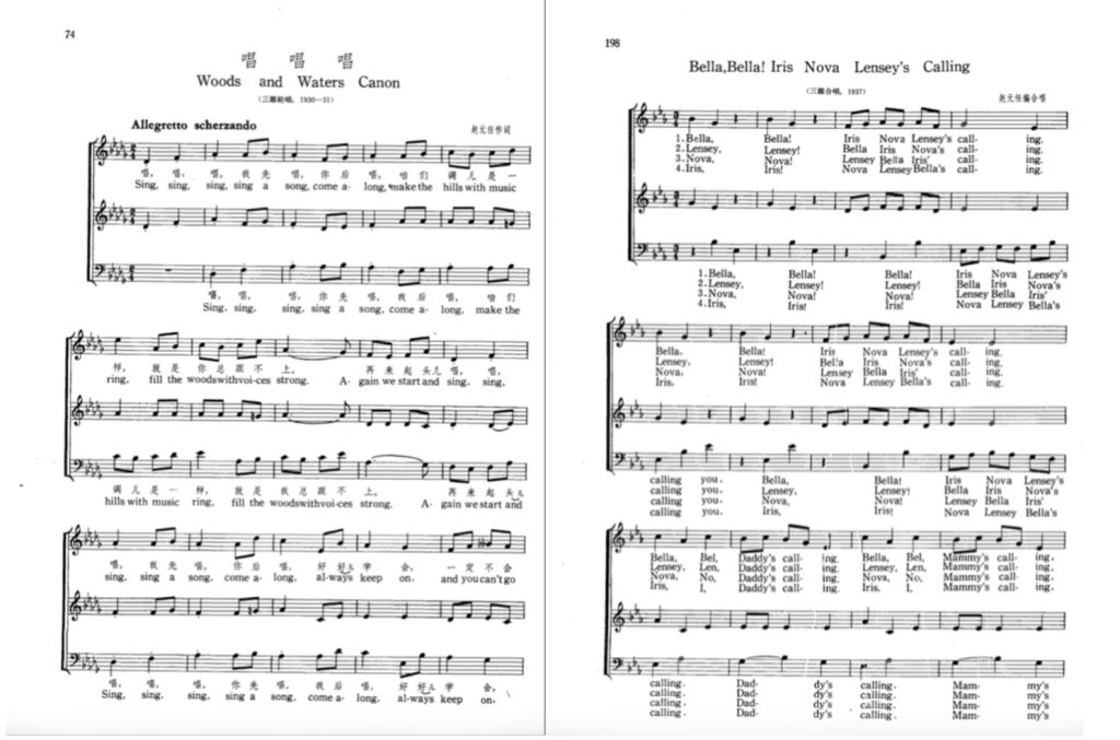 家庭成员的增长改变了音乐结构,生命本身变成声部增加的理由。和这首歌生成过程很像的还有1937年的一曲《Bella,Bella! Iris Nova Lensey’s Calling》。这首歌的曲名是赵氏四位女儿的英文名,赵元任根据一首钢琴曲改编的,每次名字轮流变化,上面两声部分别由女儿唱,低音部分显然是赵氏自己唱。