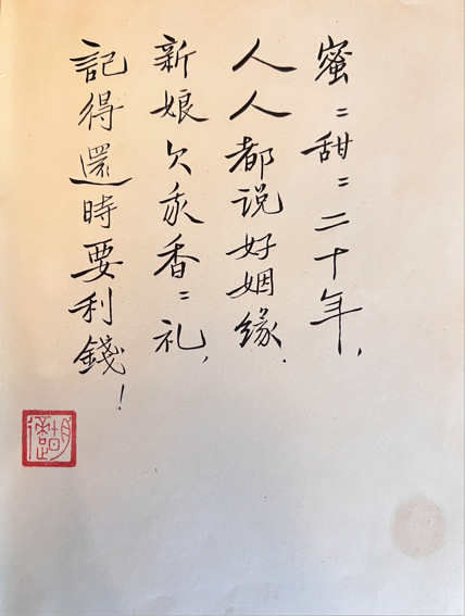 说到家庭,黄家林透露,继《好玩儿的大师 赵元任影记之学术篇》之后,该系列的新书将在近期出版,关于赵元任的爱情与家庭,题目暂定《人人都说好姻缘》,里面有部分故事在郑绩老师新书《她们的西南联大岁月》里也有提到,如中央公园拍照、请证婚人、罗素交谈、印花税等。涉及“谁提议的印花税”这一话题,黄先生表示外公和外婆的记忆有抵牾之处。黄家林最后还展示了胡适在赵氏夫妇二人银婚25周年时写的诗歌,俏皮有趣。摘抄如下:“蜜蜜甜甜二十年,人人都说好姻缘。新娘欠我香香礼,记得还时要利钱。”——《人人都说好姻缘》的书名即出自于此。