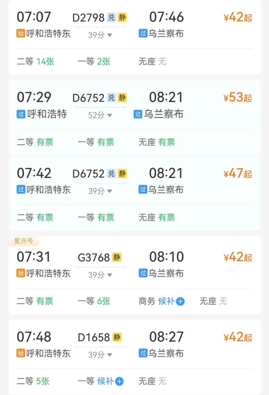 ↓呼和浩特至乌兰察布推荐车次↓