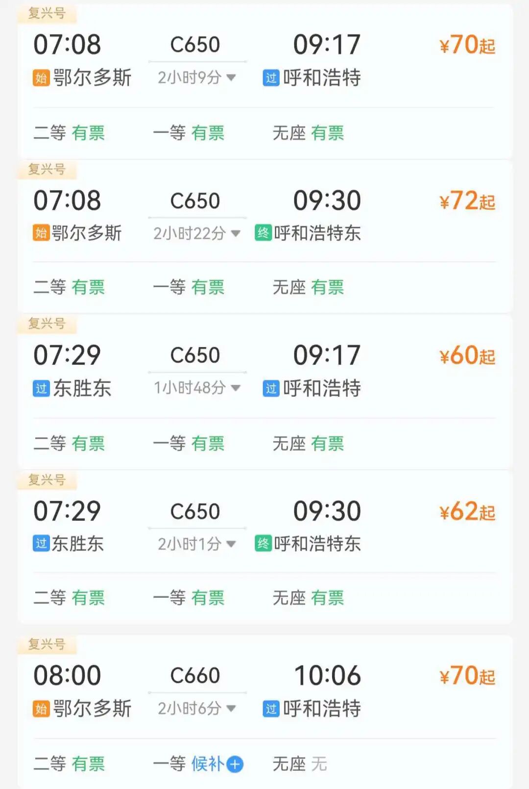 ↓鄂尔多斯至呼和浩特推荐车次↓