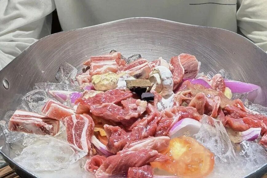 晶莹的冰块铺满铜锅,鲜红的羊肉块整齐码放,加入简单的葱姜、红酒和秘制调料。锅子加热,冰块慢慢融化,锁住了羊肉最极致的鲜嫩。