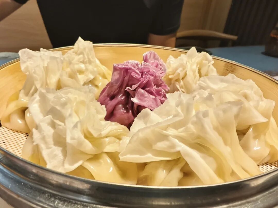 顶部不封口,蒸熟后“开花”,露馅不失汁。一口咬下去鲜香多汁,蒜醋和老砖茶是吃稍麦的灵魂拍档!