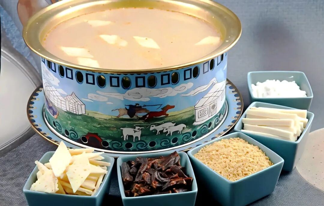 一套非常丰盛的早餐。砖茶熬煮后加入鲜奶、盐,再配炒米、奶皮、奶豆腐、黄油、风干肉等,咸香浓郁,暖胃又顶饱。