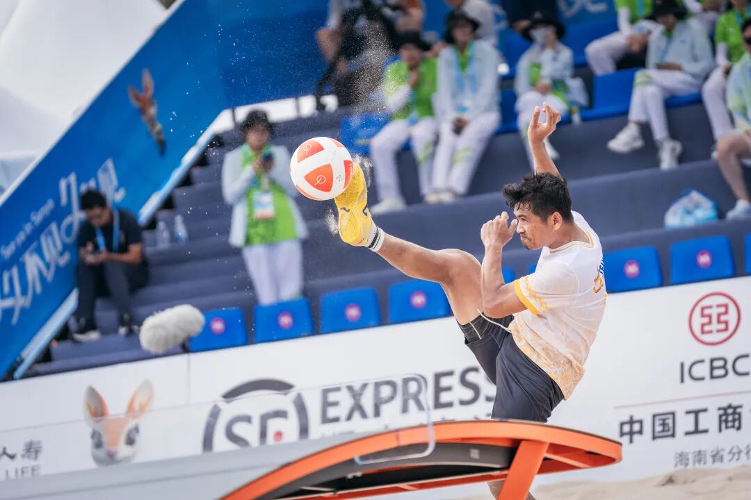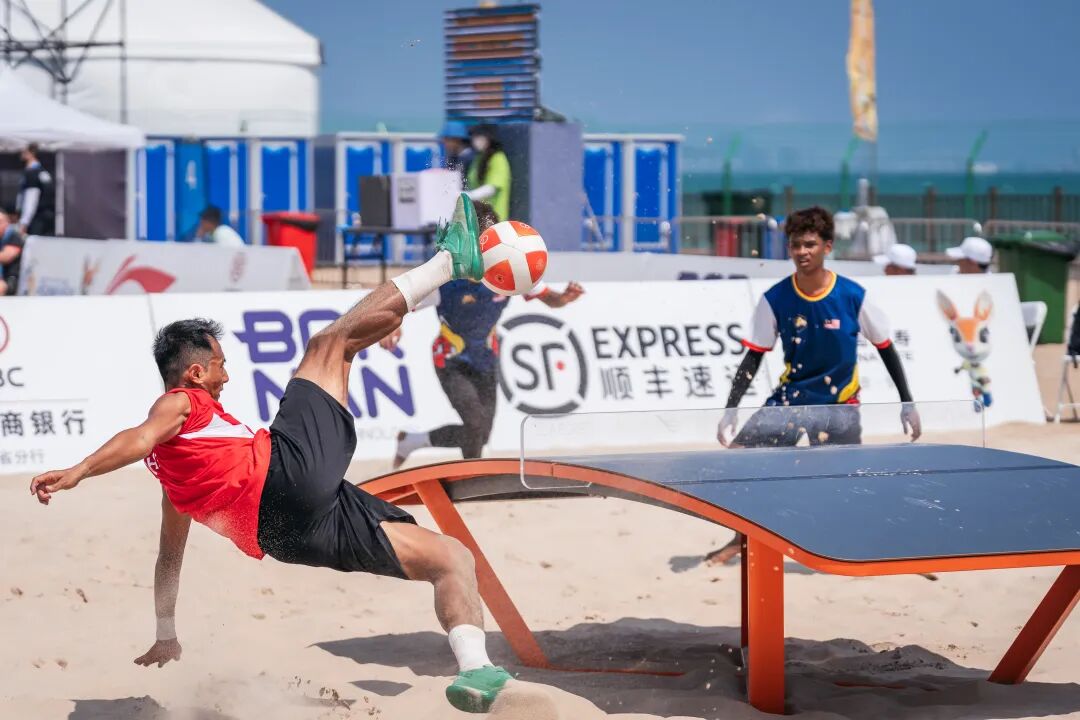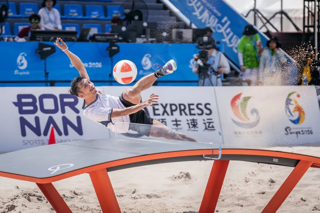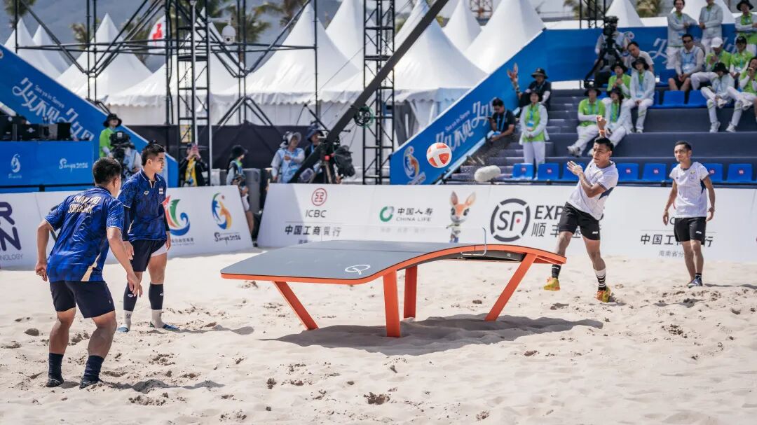 4月26日,第六届亚洲沙滩运动会台克球项目赛事在三亚湾继续举行,吸引了大批观众到场观赛。男子双打小组赛率先拉开帷幕,头顶、倒勾、扣杀,运动员们用一个个高难度动作不断挑战着身体极限,也给观众们带来了一场酣畅淋漓的视觉盛宴。
