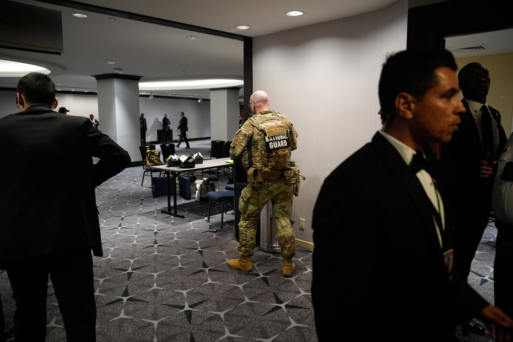 当地时间2026年4月25日,美国华盛顿特区,一名国民警卫队军官在白宫记者协会晚宴期间对枪击报告作出响应。视觉中国 图