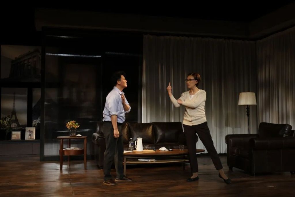 国话版《比萨斜塔》的舞台布景偏向现实主义,更多是在营造一个真实的家庭生活环境。王剑男补充道,演出中几次传来的火车车轮滚滚声,是设计时稍微往意象化方向添加的一笔。“这是原著剧本中没有的一个听觉符号,它几乎成了每一次夫妻吵架间隙的背景音。从现实逻辑来说,也许这家人就住在铁道旁边。我的理解是,车轮声前几次响起是客观的,最后一次响起则是主观的,是这对夫妻内心波澜的一种外化。”