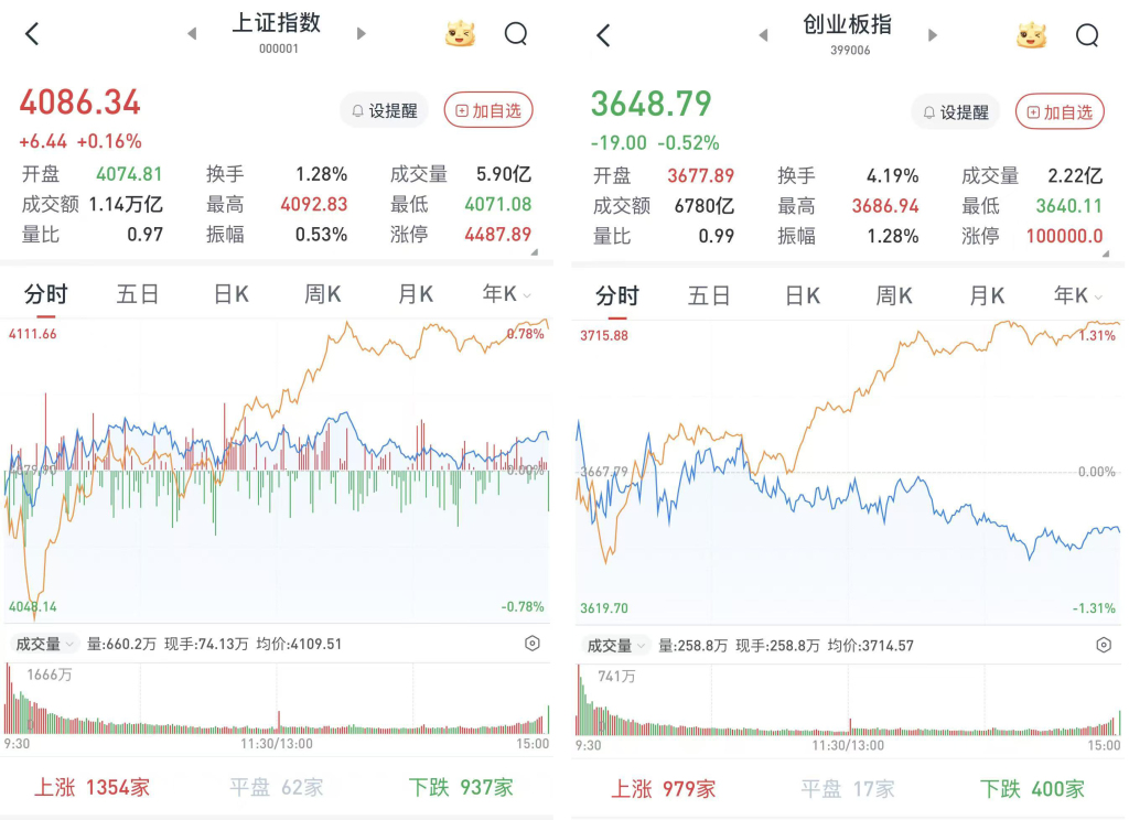 至收盘,上证综指涨0.16%,报4086.34点;深证成指涨0.37%,报14995.75点;创业板指跌0.52%,报3648.79点。