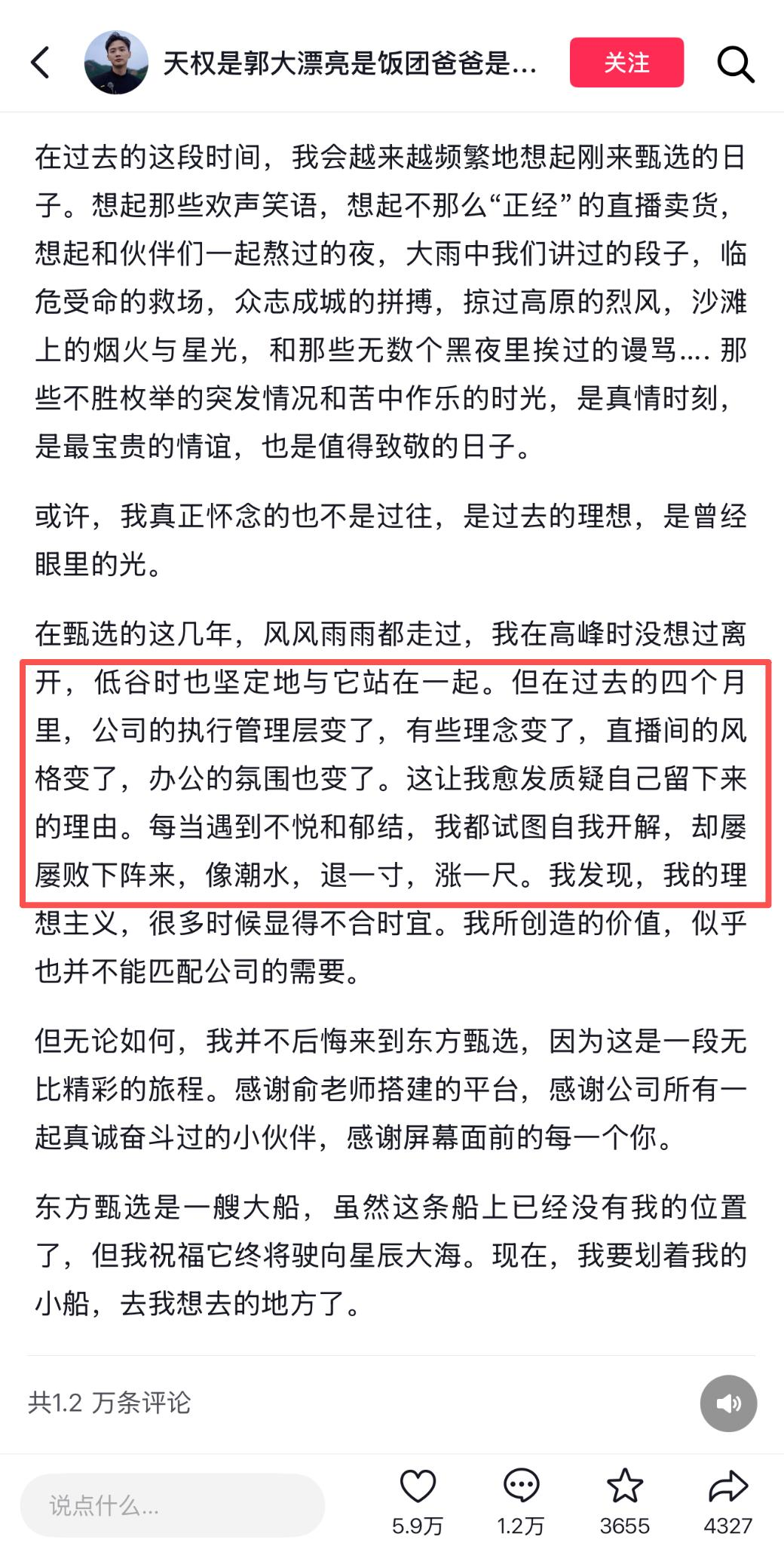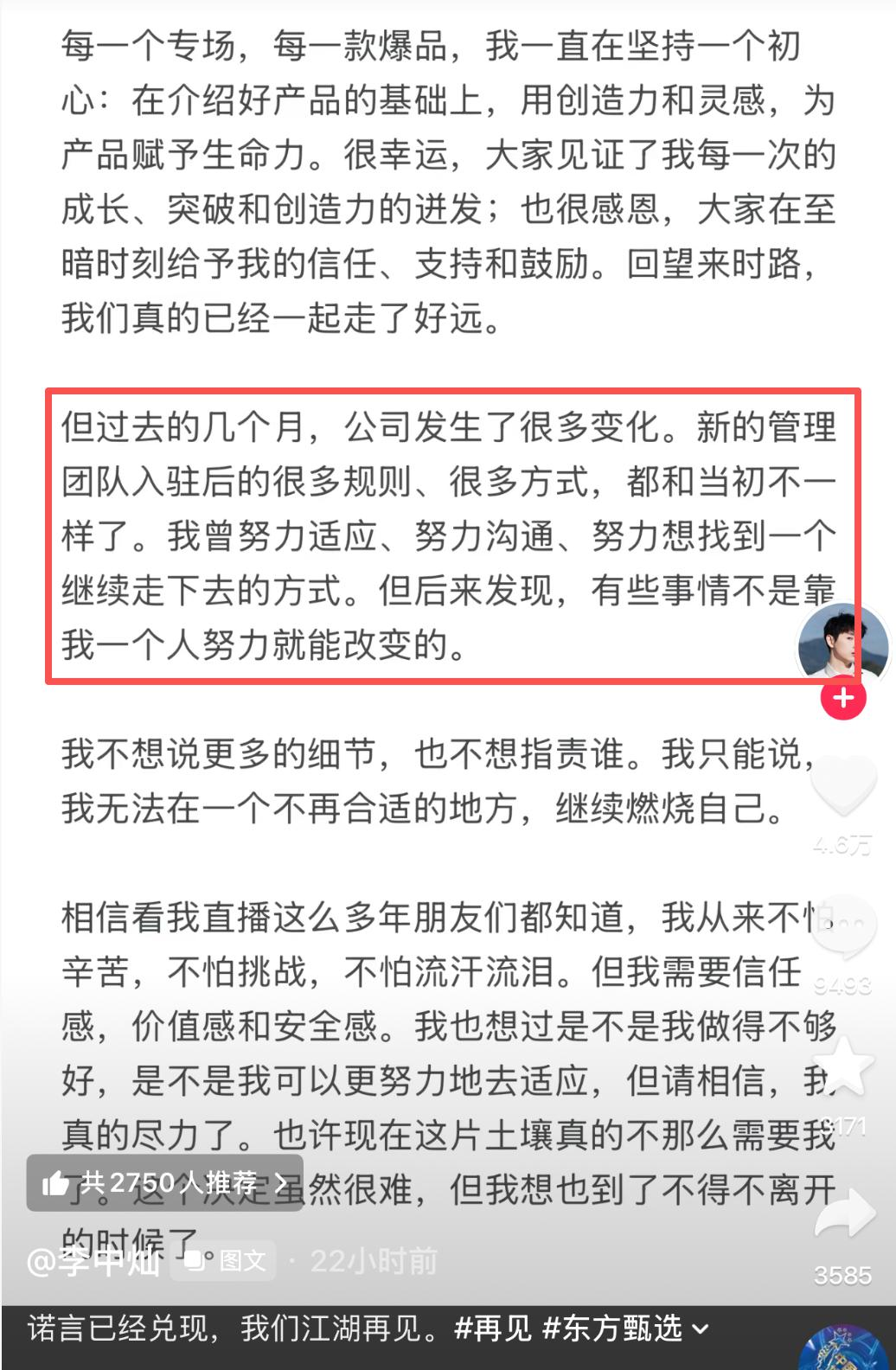 天权也在告别信中提到了对新管理层的不适应,他表示:“过去的4个月里,公司的执行管理层变了,有些理念变了,直播间的风格变了,办公的氛围也变了。”