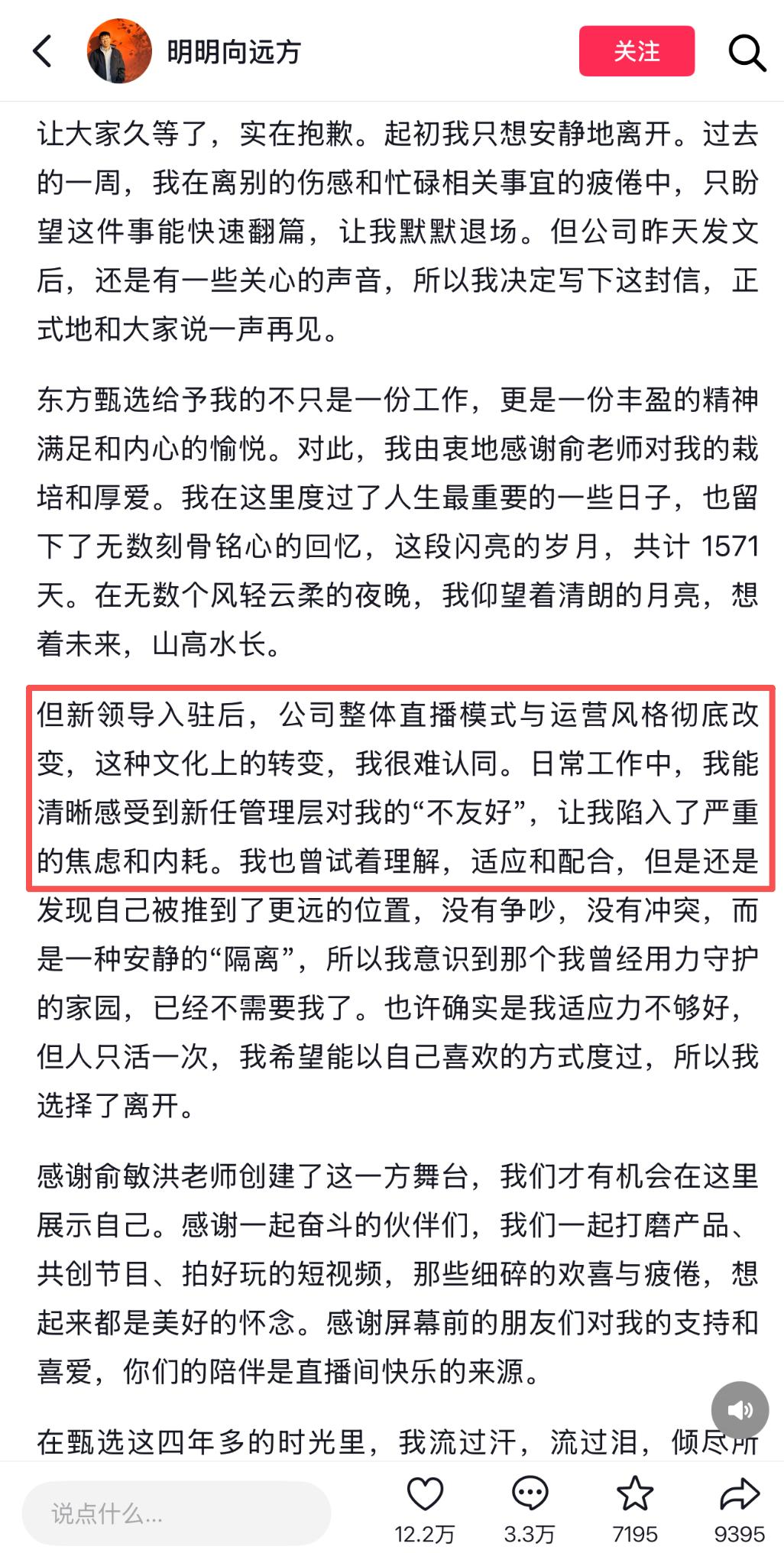 4位主播离职后,俞敏洪也在直播里反思,管理层调整后“过度侧重制度管控、忽视团队人文关怀,导致团队氛围出现问题”。