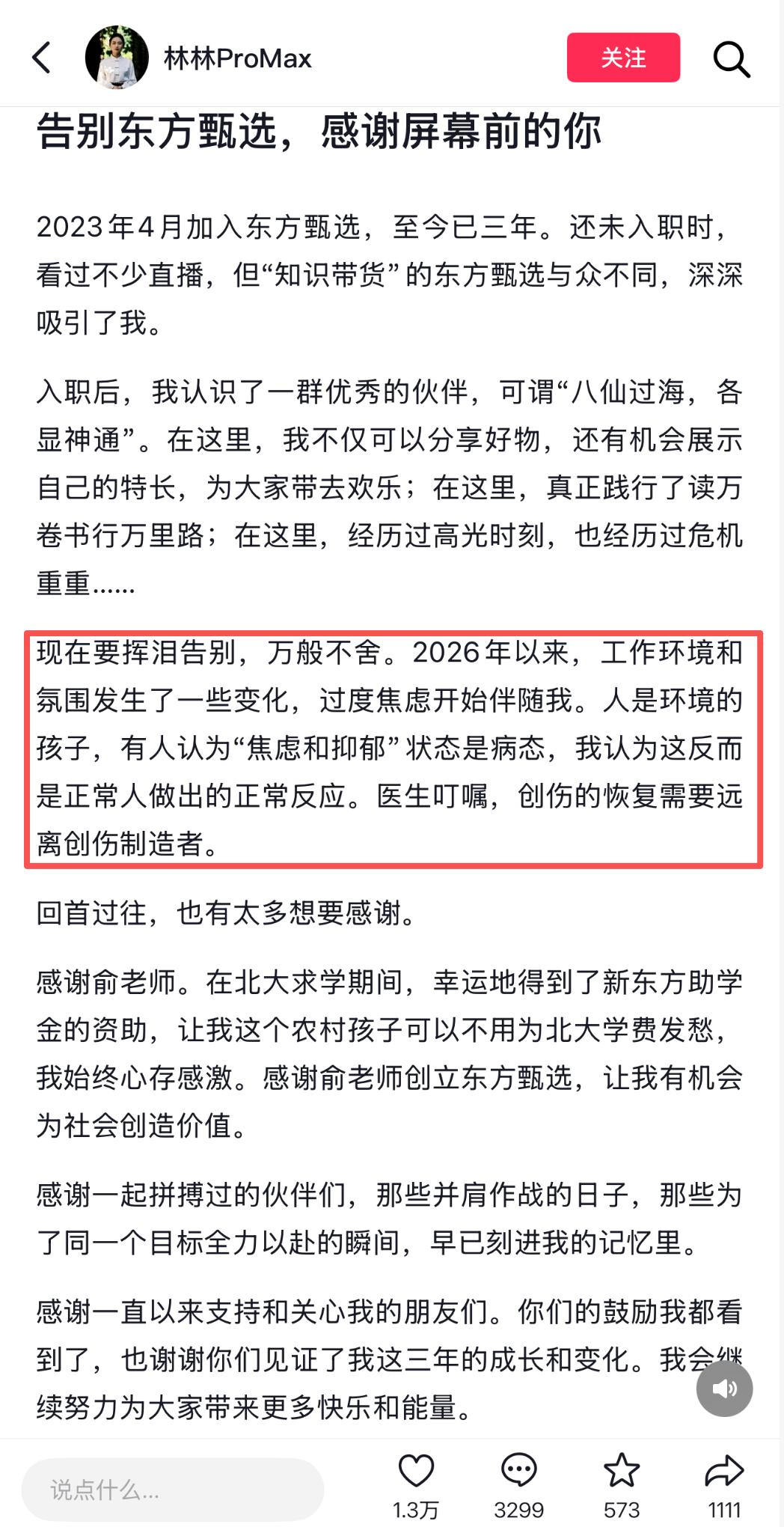 此外,林林也表示,2026年以来,工作环境和氛围发生了一些变化,过度焦虑开始伴随她。医生叮嘱,创伤的恢复需要远离创伤制造者。