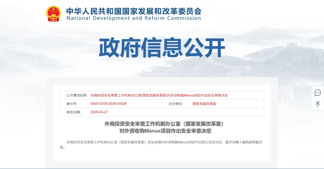 据国家发展改革委网站4月27日消息,外商投资安全审查工作机制办公室(国家发展改革委)依法依规对外资收购Manus项目作出禁止投资决定,要求当事人撤销该收购交易。