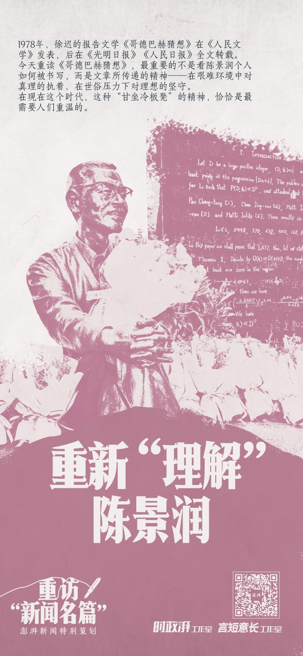 “《哥德巴赫猜想》是我非常喜爱且熟悉的文学作品,特别是在父亲离开之后,阅读《哥德巴赫猜想》也成为我抒发思念的方式之一。”近日,陈景润之子陈由伟在接受澎湃新闻记者专访时表示,今天重读《哥德巴赫猜想》,最重要的不是看陈景润个人如何被书写,而是文章所传递的精神——在艰难环境中对真理的执着、在世俗压力下对理想的坚守。在现在这个时代,这种“甘坐冷板凳”的精神,恰恰是最需要人们重温的。
