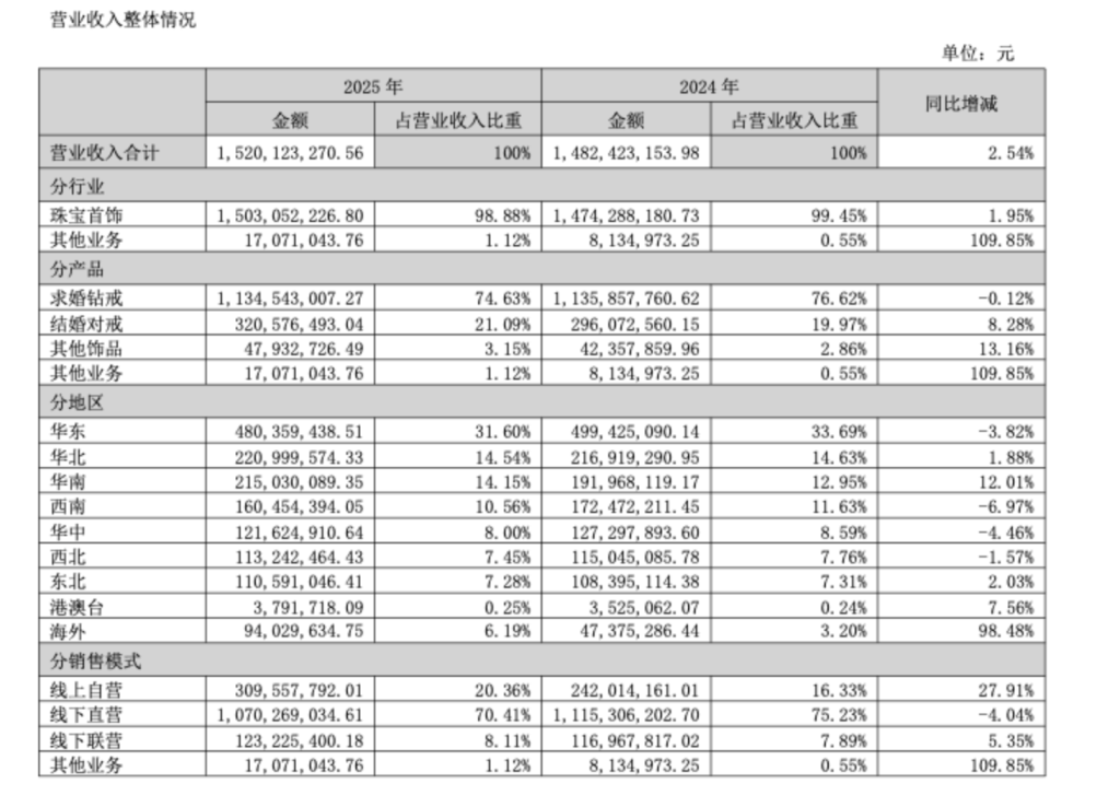 产品方面,求婚钻戒营收11.35亿元,同比微降0.12%,占总营收的74.63%;结婚对戒营收3.21亿元,同比增长8.28%,占总营收的21.09%;其他饰品营收4793万元,同比增长13.16%,占总营收的3.15%。