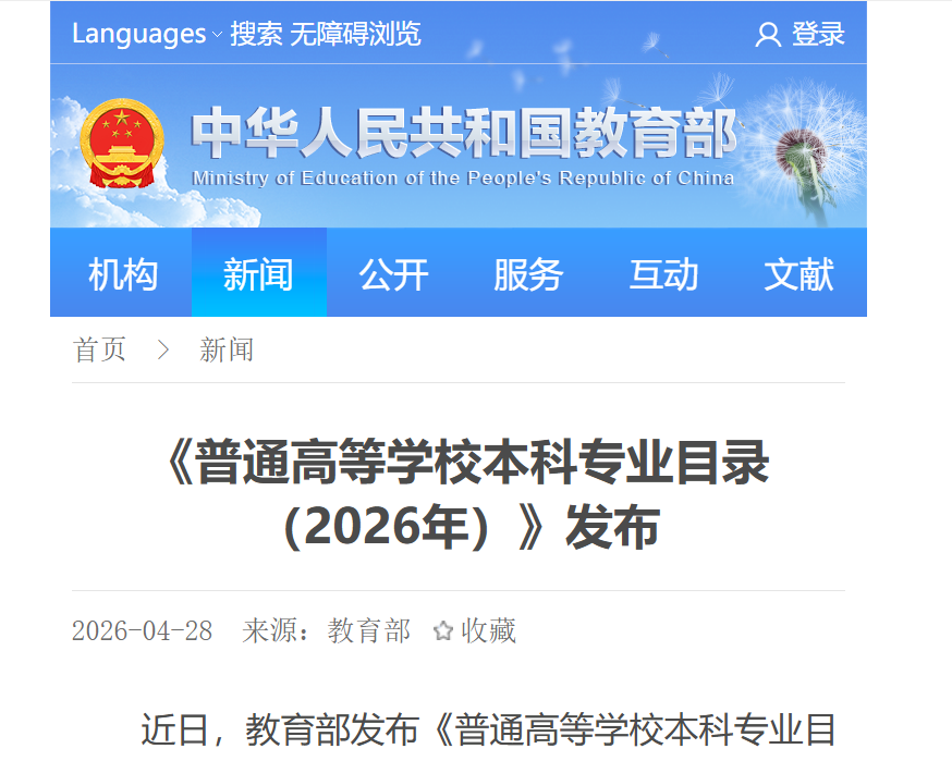 近日,教育部发布《普通高等学校本科专业目录(2026年)》(简称“2026年本科专业目录”),以科技创新、产业发展和国家战略需求为牵引,持续提升高等教育对高质量发展的支撑力和贡献力。