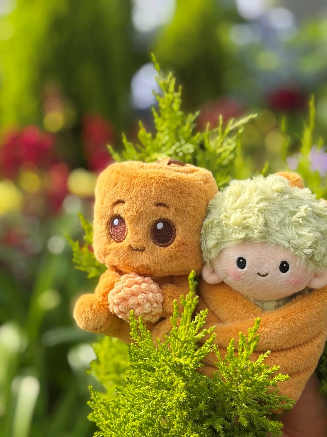 “梧梧”,是老树的温柔投射——一截刻着年轮的树干,长出了大眼睛和小手小脚,稳稳捧着一颗梧桐果。它像你在路口总遇见的那棵老树,不声不响,却一直在那里等你下班、散步经过。