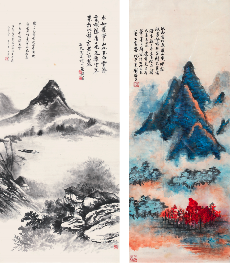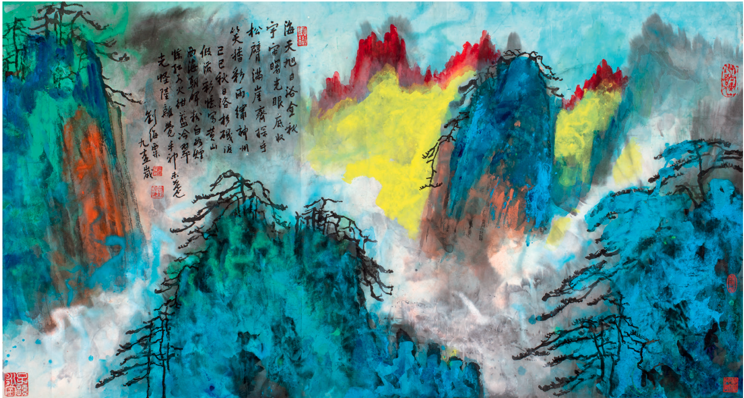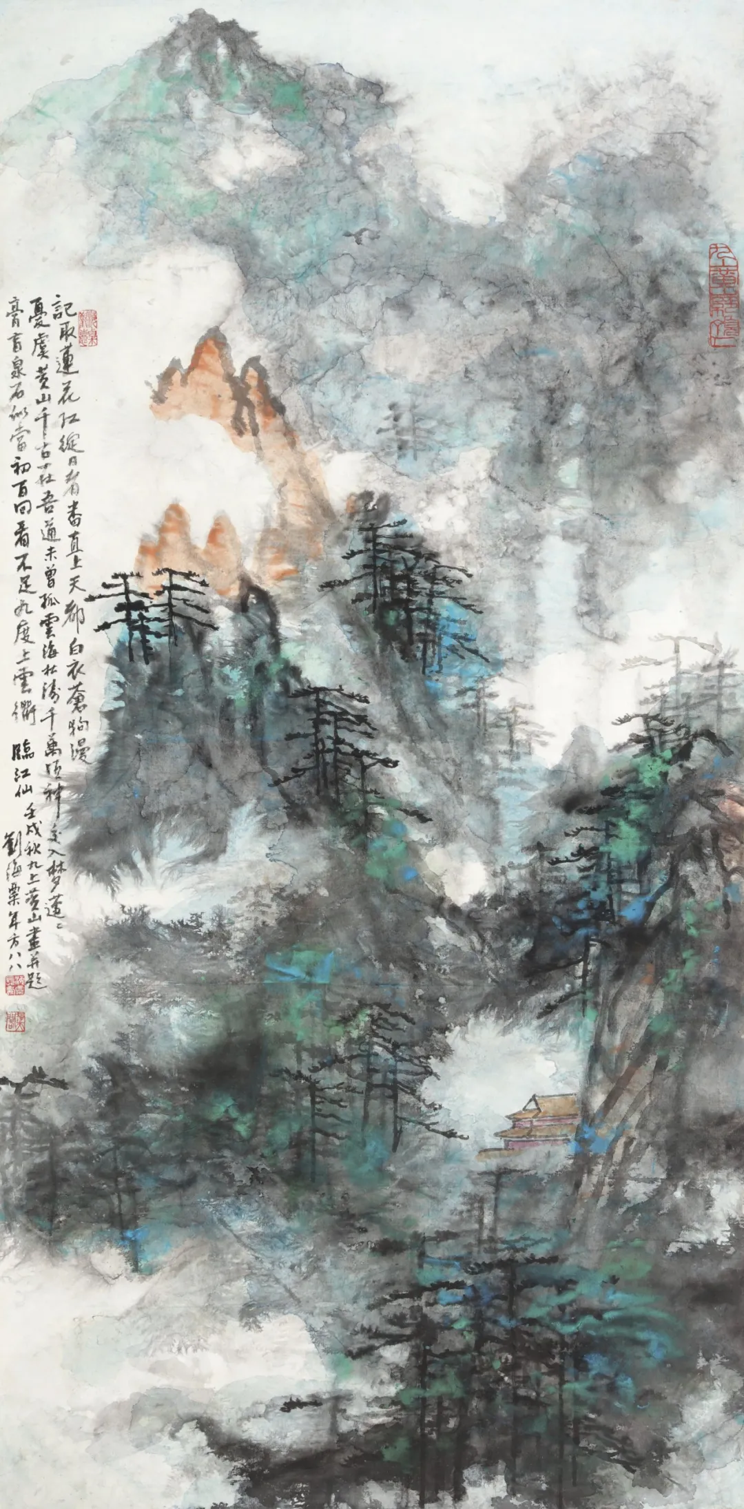 刘海粟一生深耕艺术,力求将心中所思所感充分呈现在画面之上,为此他耗费数十年功夫潜心研究。他所倡导的中西融合理念,在展出的画作中有着鲜明体现:其中至关重要的一点,便是借鉴西画用色彩表现光的明暗关系的手法,同时以国画水墨展现云雾吞吐的意境。