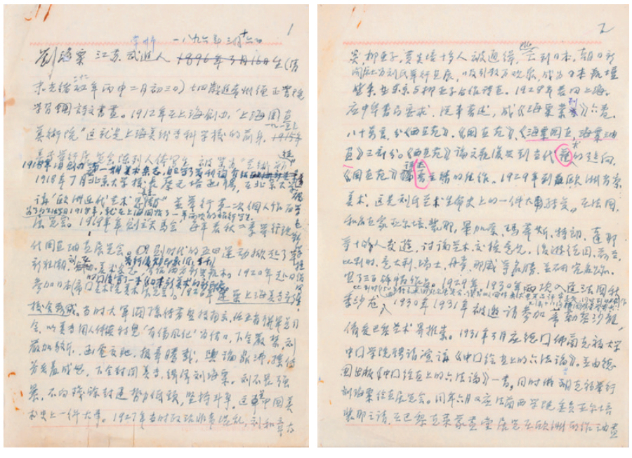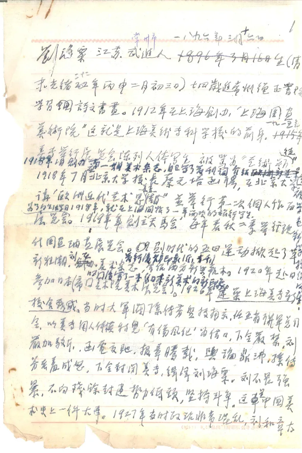 据刘海粟先生弟子、收藏家陈利介绍,展览中包括刘海粟先生的9页自书生平履历,这份文献极为罕见。当中书写刘海粟自1896年出生以来,至1979年的人生经历与艺术活动。详述包括创办上海美专与天马会、人体模特事件、著《海粟丛刊》、欧洲考察研究、海外办展、抗日战争流亡、平反经历等在内的重要事件。“中间部分有他人修改的痕迹,海老将修改内容贴在侧边,原稿核心内容得以完整保留,且这份自述为可翻看的形式,极具收藏与研究价值。”陈利说。