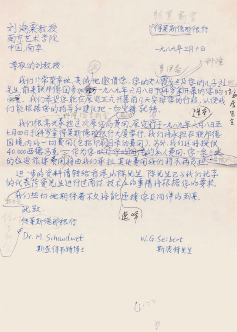 另有1989年的相关珍贵文献:当年德国德累斯顿银行出资邀请刘海粟赴德举办画展,刘海粟对此极为重视,因为自上世纪二三十年代在德国举办过画展后,他便再未赴德办展。这份文献中,有先生亲笔撰写的展览目录,详细记录了参展作品的创作年份、尺寸、形式(长卷、横幅、立轴等),共记录展出画作二十二件;还有德累斯登(即德累斯顿)银行发来的邀请函,这份邀请函最初为英文,经办事处翻译成中文后,先由陈利用铅笔修改(包括“定”“夏伊乔”“科隆”“德累斯登画册”等字样),刘海粟先生审阅后,特意添加“隆重”二字,随后这份修改稿被复印后用于办理出国手续,最终促成了画展。