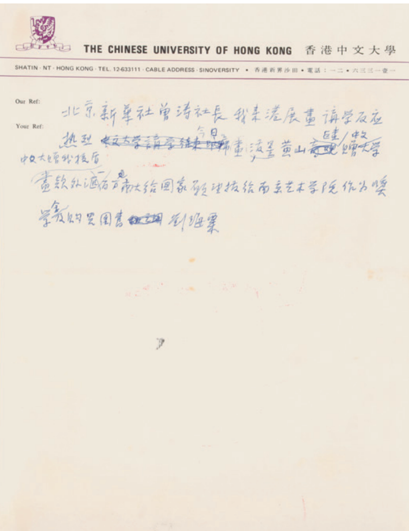 此外,展览中还首次披露了刘海粟致曾涛的信件(曾涛曾任新华社社长、全国人大新闻发言人),这封信记录了刘海粟赴香港讲学的相关事宜:信中原本写有“我来港展画讲学,反应热烈”,后划去,再精简为“今日画泼墨黄山巨画赠中文大学,中大赠我校盾,画款外汇100万献给国家,愿望拨给南京艺术学院作为奖学金及购买图书”,落款为刘海粟。这份信件的文献价值在于,是南京艺术学院刘海粟奖学金创办40多年来最原始的记录。据介绍,这些珍贵信件此次也是首次公开亮相。