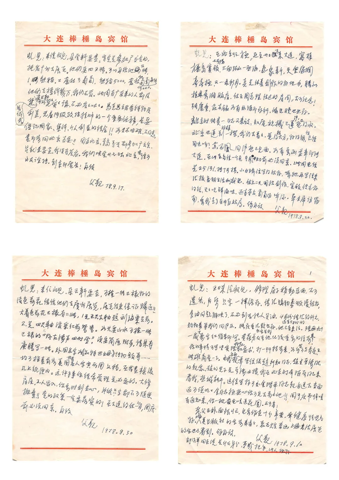 展出的刘海粟致儿子刘虬信札共计四通四页,皆为1978年8月、9月前后所写。时刘海粟辗转于北京、大连等地,写信嘱托居于上海的刘虬,代为处理画作参展、好友属书等事宜。