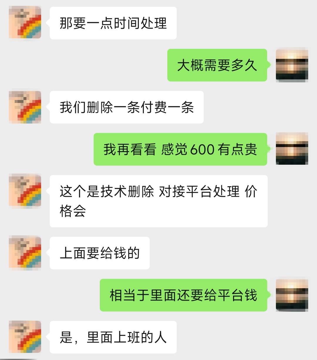 但也存在例外情况。沟通中,有删评人坦言,如果差评被删除,消费者会收到“评价违规不做展示”的平台提示。对方还称,他们会对接平台,通过技术手段删除差评,“删除一条付一次费,单条价格600元,我们会把钱付给平台内部人员,由他们操作删除”。