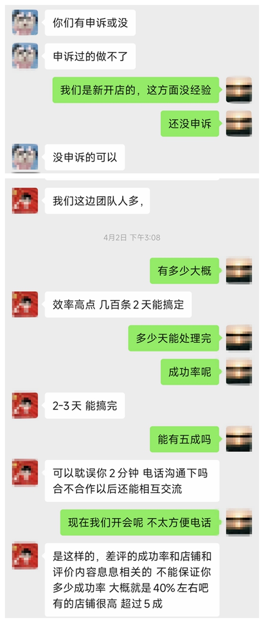 此外需要注意的是,不少商家曾遭遇删评诈骗,“之前被骗了700块,对方一开始一直拖时间,后来直接把我拉黑了”。记者在暗访中发现,有的删评人声称可以100%删除差评,但要求操作前先交1500元定金。