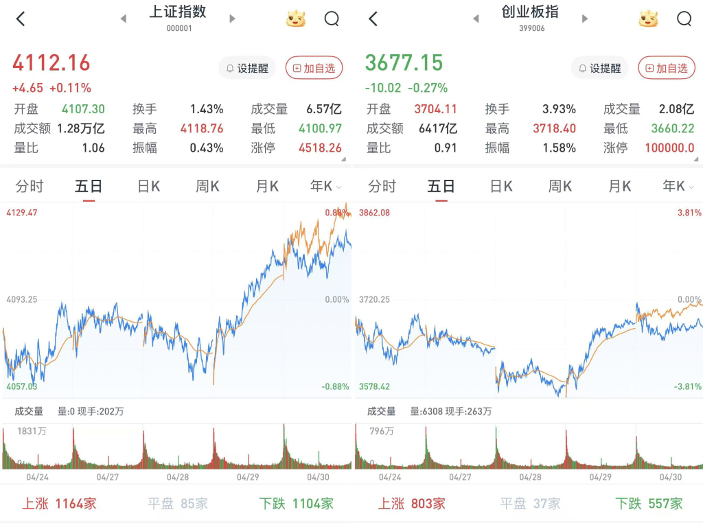 财信证券认为,往后看,一方面,年报以及一季报基本落地,业绩风险得到一定释放,市场风险偏好或将有所回暖;另一方面,尽管临近“五一”假期,但从当日走势来看,资金对节后行情仍持乐观态度,本月最后一个交易日可适当布局节后有行情预期的方向。因此短期内,可继续逢低关注近期具备事件催化或者高景气度且估值合理的板块以及个股。中长期看,本轮A股行情基础依旧牢固,对市场长期向好的趋势仍然抱有信心,4月底后,随着业绩压制因素消退、宏观增量政策预期加大,观察届时市场是否走出新一轮趋势行情。