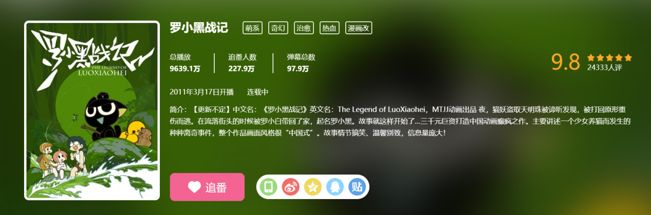 2011年3月17日,木头制作的Flash动画《罗小黑战记》第一集正式发布。截至目前,前后8年时间,在粉丝们的不断“催更”下,《罗小黑战记》总共更新了28集,每集平均只有5分钟,是国内更新速度最慢的连载动画。乃至于网络上有这样的调侃,“小黑剧集更新日,家祭无忘告乃翁。”目前该片在B站上的总点击量近亿次。今年8月27日才更新的第28集,弹幕上密密麻麻的“有生之年”。