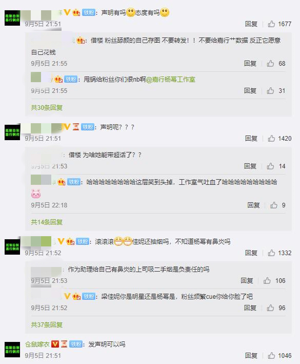 9月5日,杨幂关闭了微博评论,同日工作室发布的杨幂新的代言图,粉丝们不再是以往爱的控评,而是要求“发声明”。