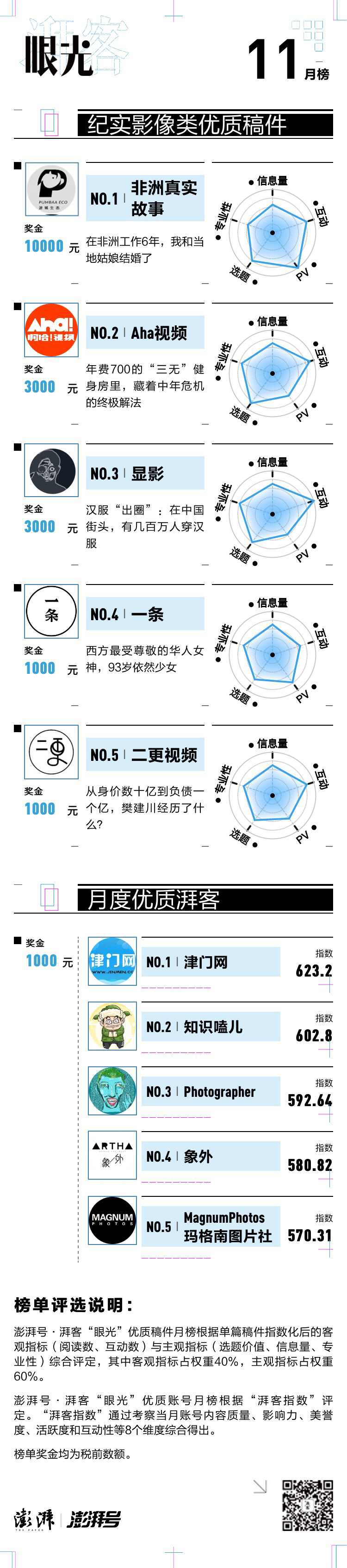 11月(2019年11月1日~2019年11月30日),超过1500个以机构、媒体和自媒体为主体的创作者们形成了稳定且高质量的内容产出,共在澎湃新闻“湃客”专业创作者平台发布2550篇优质稿件,收获了3.35亿的阅读量。在“湃客·眼光”纪实影像内容排行榜中,我们通过主、客观五个维度对每一篇入围的优质内容进行考察,输出内容综合指数,选出了新一期的“湃客”眼光栏目的排行榜前五和优质湃客号前五。