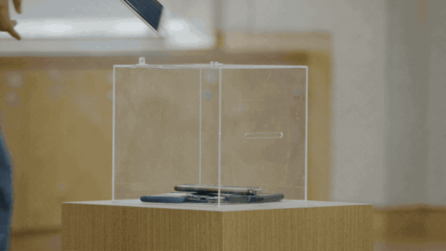 工作人员会在中间放一个透明盒子,每个人轮流和手机告别,交出来前记得要先关机,不然手机可能会在这箱子里一直响。