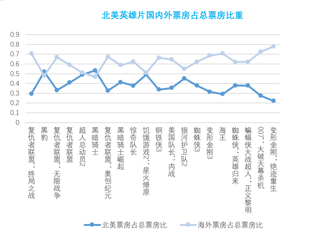 从北美20部英雄片海内外票房占比来看,除了黑豹和黑暗骑士,其余所有电影都是海外票房占比大于美国国内票房占比,也就是说,美国的英雄电影在美国以外同样受到观众的热烈欢迎。北美英雄片除了拥有大量英雄类漫画的粉丝基础之外,还不断根据美国的政治文化环境调整英雄片的类型,从原本白人男子占主导的英雄角色,发展到如今大火的黑人英雄,象征女权的女性英雄如《惊奇队长》《神奇女侠》,在经典基础之上不断超越变革,迎合大环境和市场。