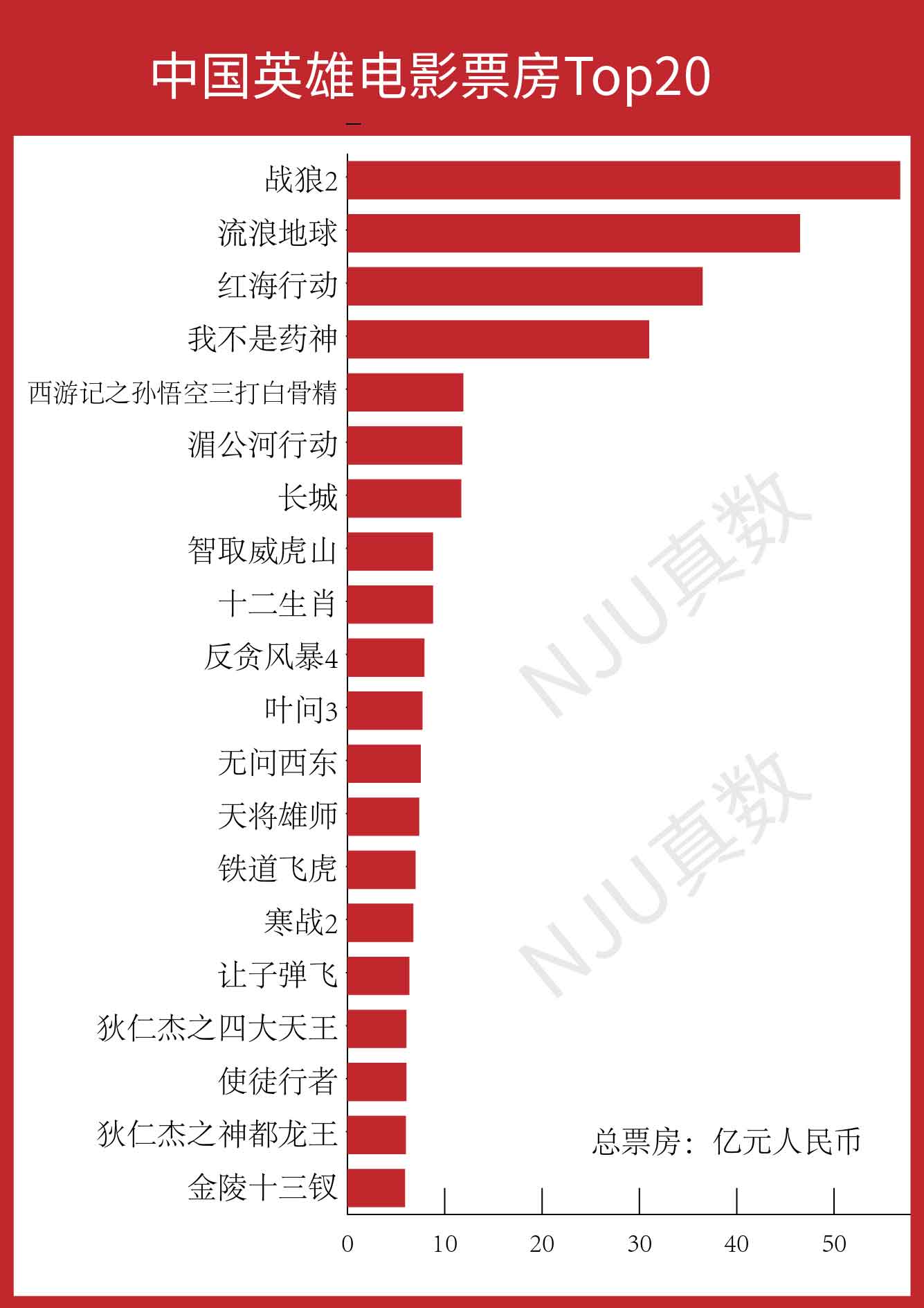 从上图可以看出,中国超级英雄电影的受欢迎程度远小于美国。前四部影片的票房数据非常可观,第5名《西游记之孙悟空三打白骨精》和第4名的《我不是药神》相差了近18亿。2017年上映的《战狼2》,迄今仍然是内地电影票房冠军,它的主旋律基调、制作用心的画面、充满导演吴京个人特色的“硬核”风格,都让这部影片广受欢迎。