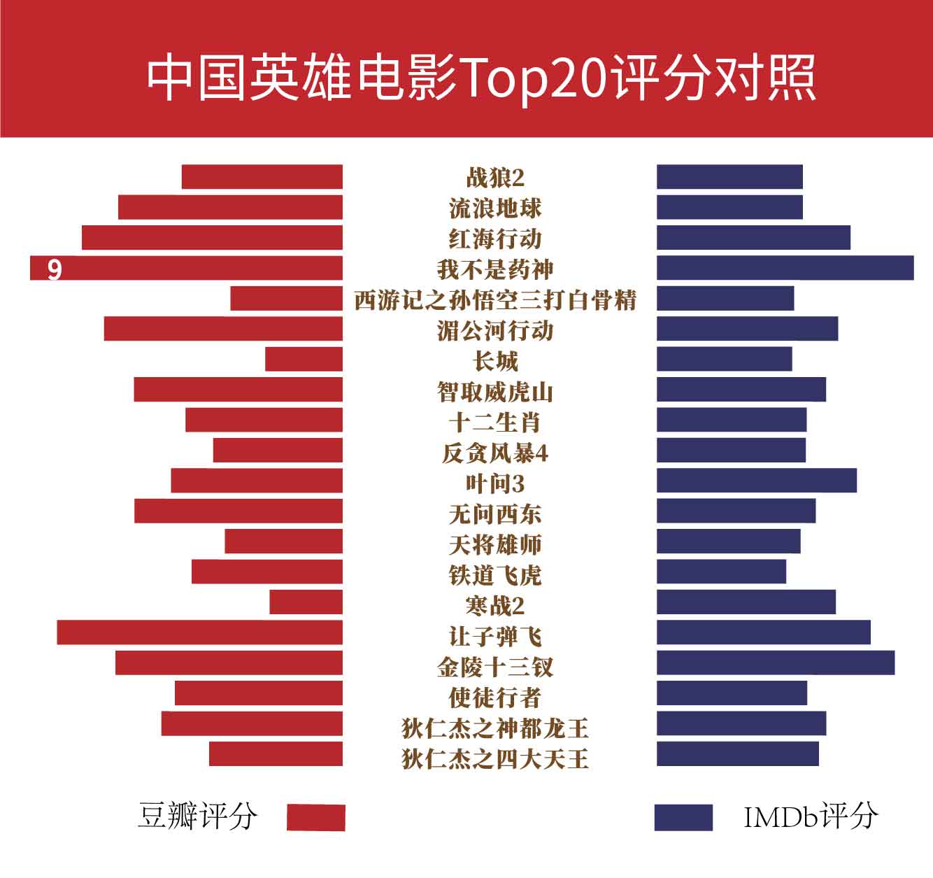 而海外观众对中国英雄片则显得水土不服,评价偏低。其中,评分在8分以上的仅有一部《我不是药神》。 20部电影的整体均分只有6.53。