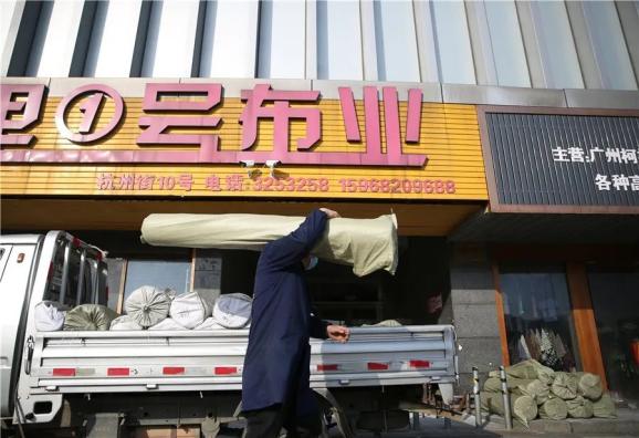 2月22日,织里国际童装城,一名工人在配送棉布,随着童装企业复工复产渐渐回暖,市场的产业链也在逐步自我修复。