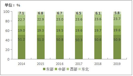 2019年,东部、西部地区占比分别为50.9%、23.7%,分别比上年提升0.3、0.1个百分点;中部、东北地区占比为19.6%、5.8%,分别比上年下滑0.1、0.3个百分点。