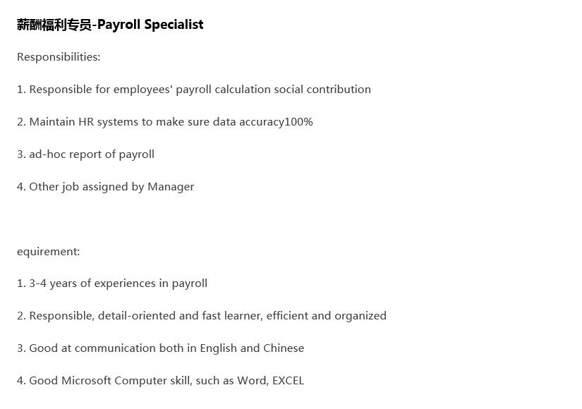 2、根据国家有关法规和政策,跟进员工五险一金等相关福利