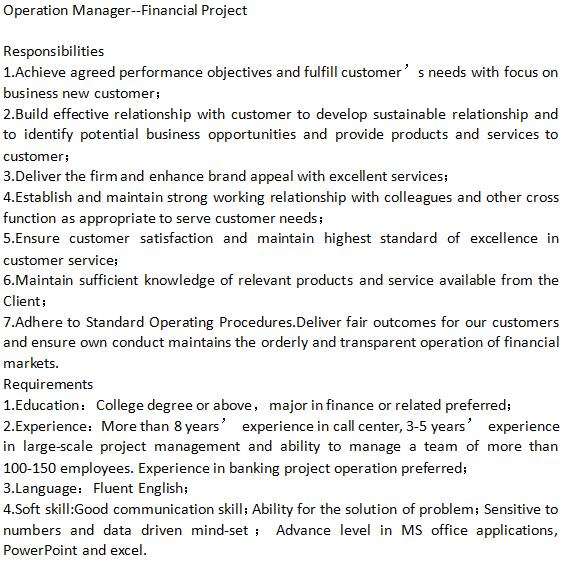 2、通过电话/电子邮件向汇丰的潜在/现有客户提供一贯准确和令人满意的客户服务,了解客户的财务需求并提供充足/合适的银行产品/解决方案