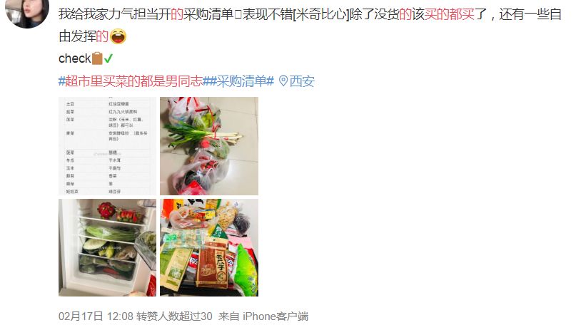 也有很多居家期间表现不错的老公,这位妻子就夸了夸老公的买菜表现非常棒!▼