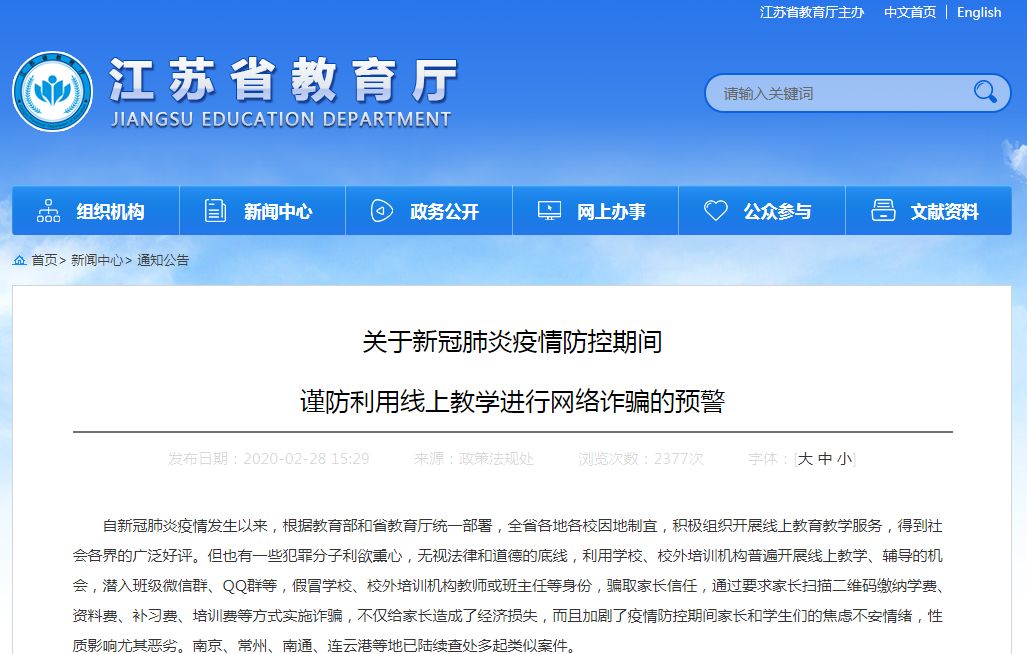 2月28日,江苏省教育厅发布《关于新冠肺炎疫情防控期间谨防利用线上教学进行网络诈骗的预警》。